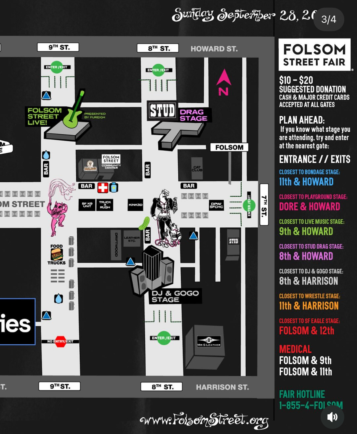 Folsom Street Fair (also referred to as just “Folsom”) is the world’s largest outdoor leather/fetish event and usually attracts half a million people every year from all over the world to the fair in San Francisco, California. The fair is produced by the Folsom Street non-profit organization raising money for an annual roster of beneficiaries. If you’re familiar with July’s Up Your Alley/Dore Alley street fair (also produced by the Folsom organization), Folsom is generally a more ‘mainstream’ and straighter affair than Dore Alley weekend. Straight kinksters and fetishists have been important partners in the fight for LGBT equality and visibility and Folsom is for them, too. Everyone realizes that after the far-right gets done outlawing queer sexual thrills, they’ll continue with the rest of the Handmaid’s Tale training manual.