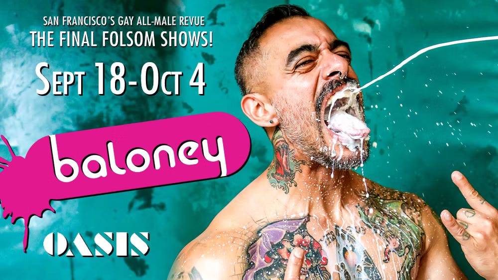 San Francisco’s “gay all-male revue that’s not entirely gay and not entirely male” is back with their Folsom edition. We’ve gone to the show several times over the years and it’s always a fun evening with these talented sexy men of all shapes and sizes and ages. Baloney combines theater, dance, striptease, song, comedy, and acrobatics into an entertaining evening unlike anything you’ve seen before. They’ve since produced more events like a game show night and Wieners, “the trashiest underwear party in San Francisco” and the captivating Gotham Pride gala set in the DC Comics universe.