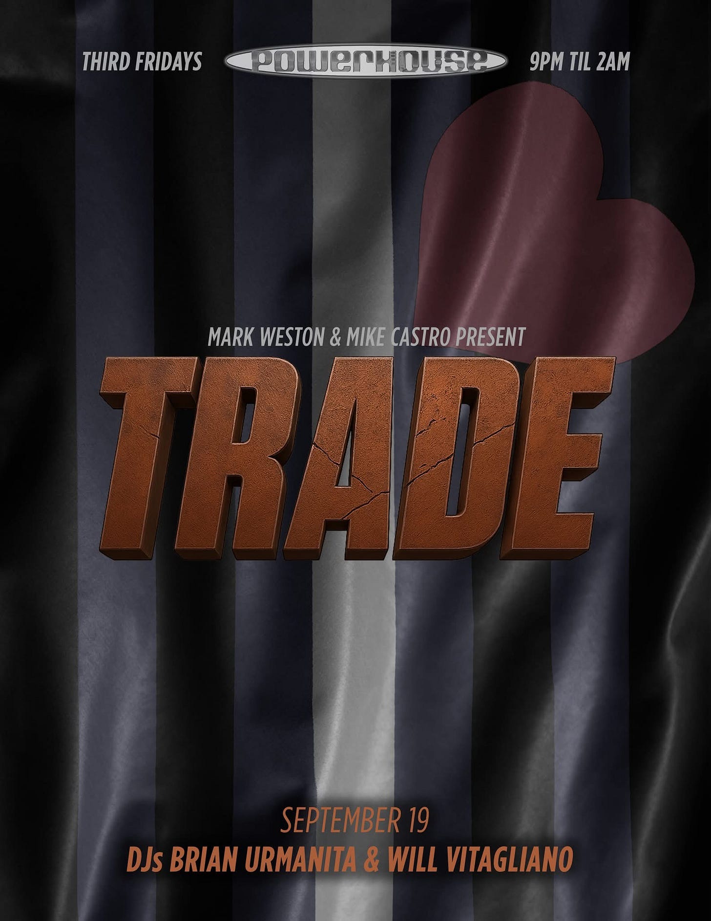 “Who you with?… TRADE! “ Mark Weston and Mike Castro are back with their every-third-Friday event Trade at Powerhouse. The freshest DJs, sexiest Gogos, and hottest vibes, making Powerhouse your go to spot to find yourself some trade . Headliner is the one and only Brian Urmanita and Will Vitagliano, kicks off the night serving up a driving melodic house/techno set.